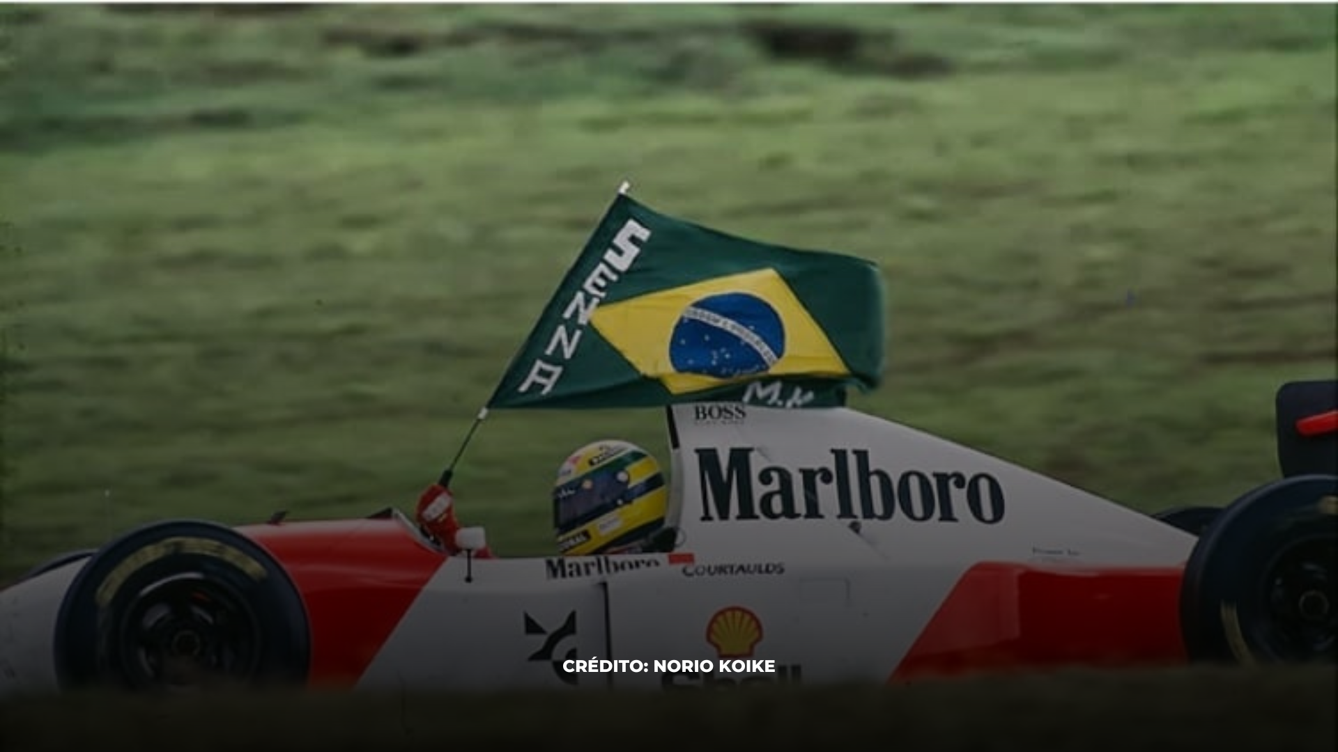 Foto: Ayrton com a bandeira do Brasil após vencer o GP de Interlagos no ano de 1993 correndo pela McLaren