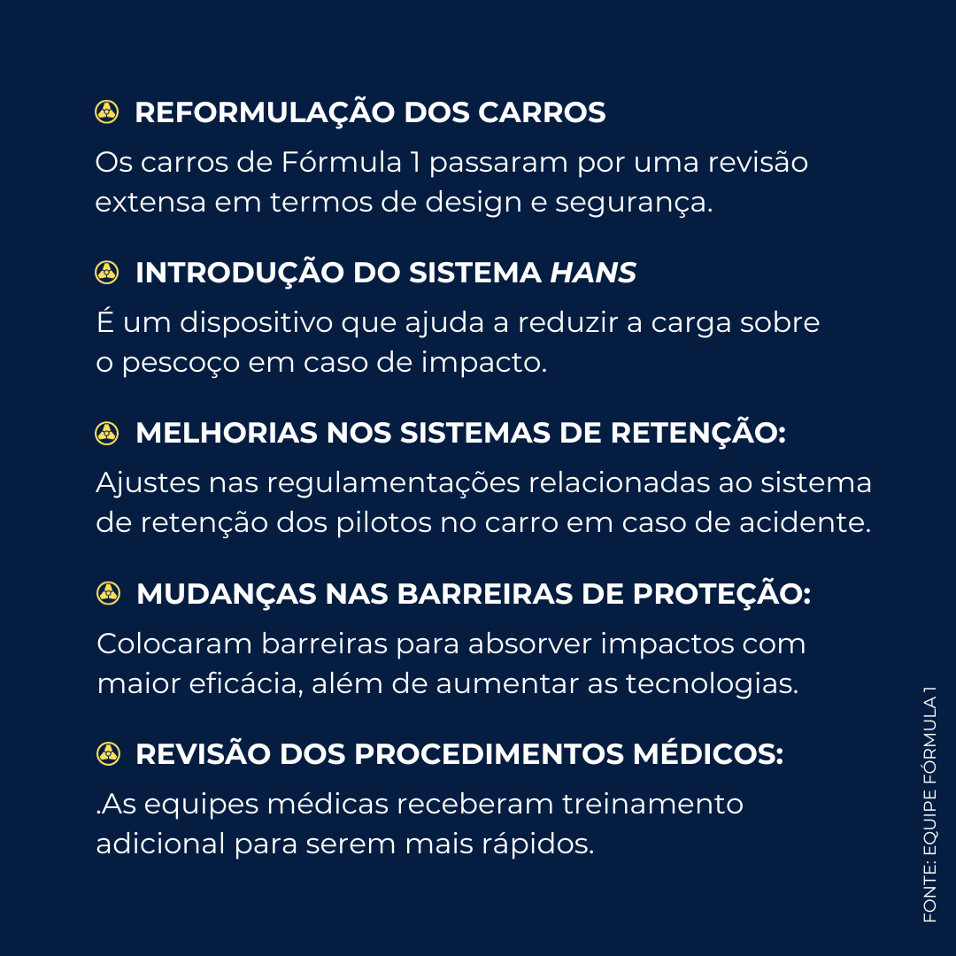 O acidente fatal de Ayrton, por exemplo, teve um impacto significativo nas regulamentações de segurança da Fórmula 1. Por conta desse acidente, o evento levou a uma revisão abrangente das normas de segurança e à implementação de diversas medidas para melhorar a proteção dos pilotos. Veja algumas das mudanças realizadas para a segurança do evento: