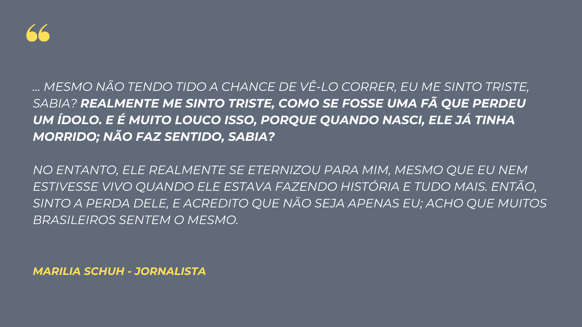 Assim como Gustavo e seu pai, a jornalista Marília Schuh do Rio Grande do Sul também relata uma admiração pelo piloto mesmo sem ter acompanhado a trajetória do Ayrton em vida: