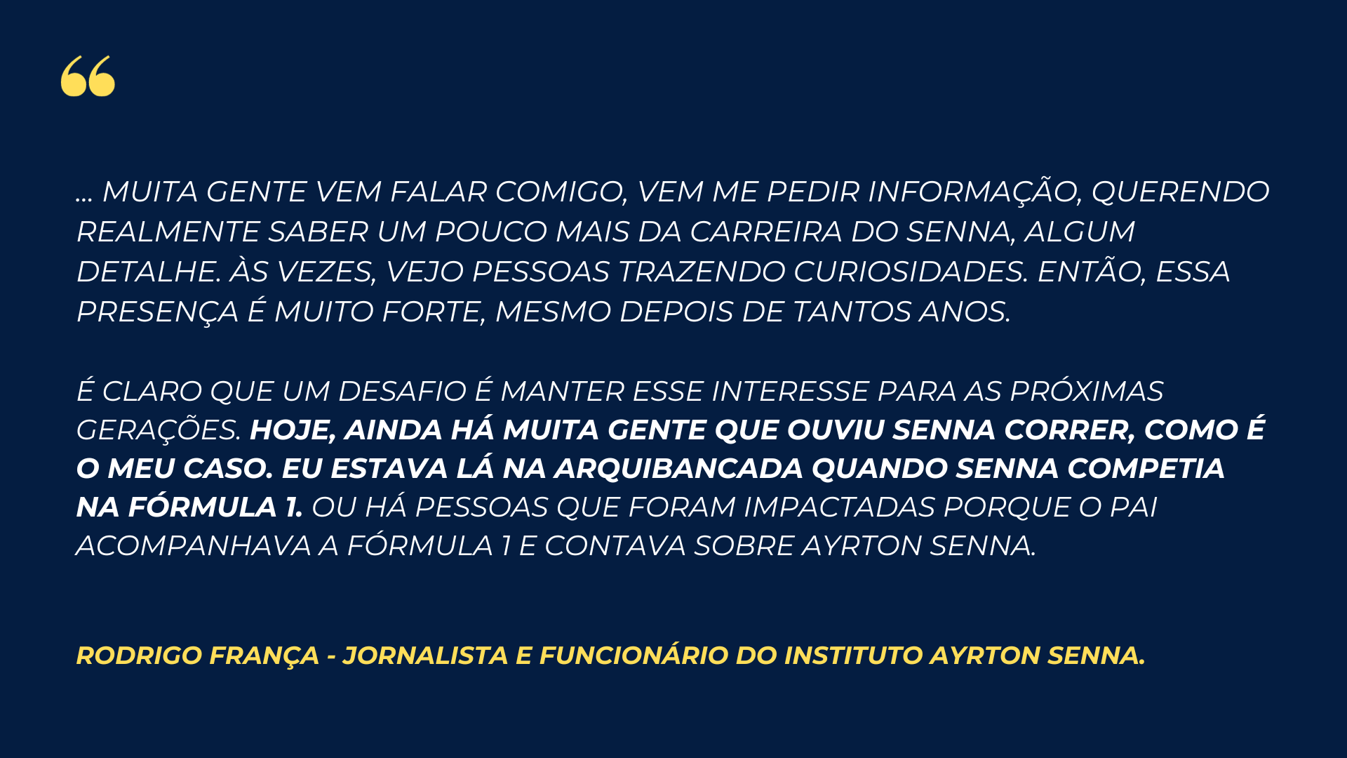 O jornalista Rodrigo França que trabalha no Instituto Ayrton Senna e tem ligação direta com Viviane Senna, irmã de Ayrton, nos leva a entender de uma maneira mais direta o que Senna significava para o Brasil durante sua carreira: