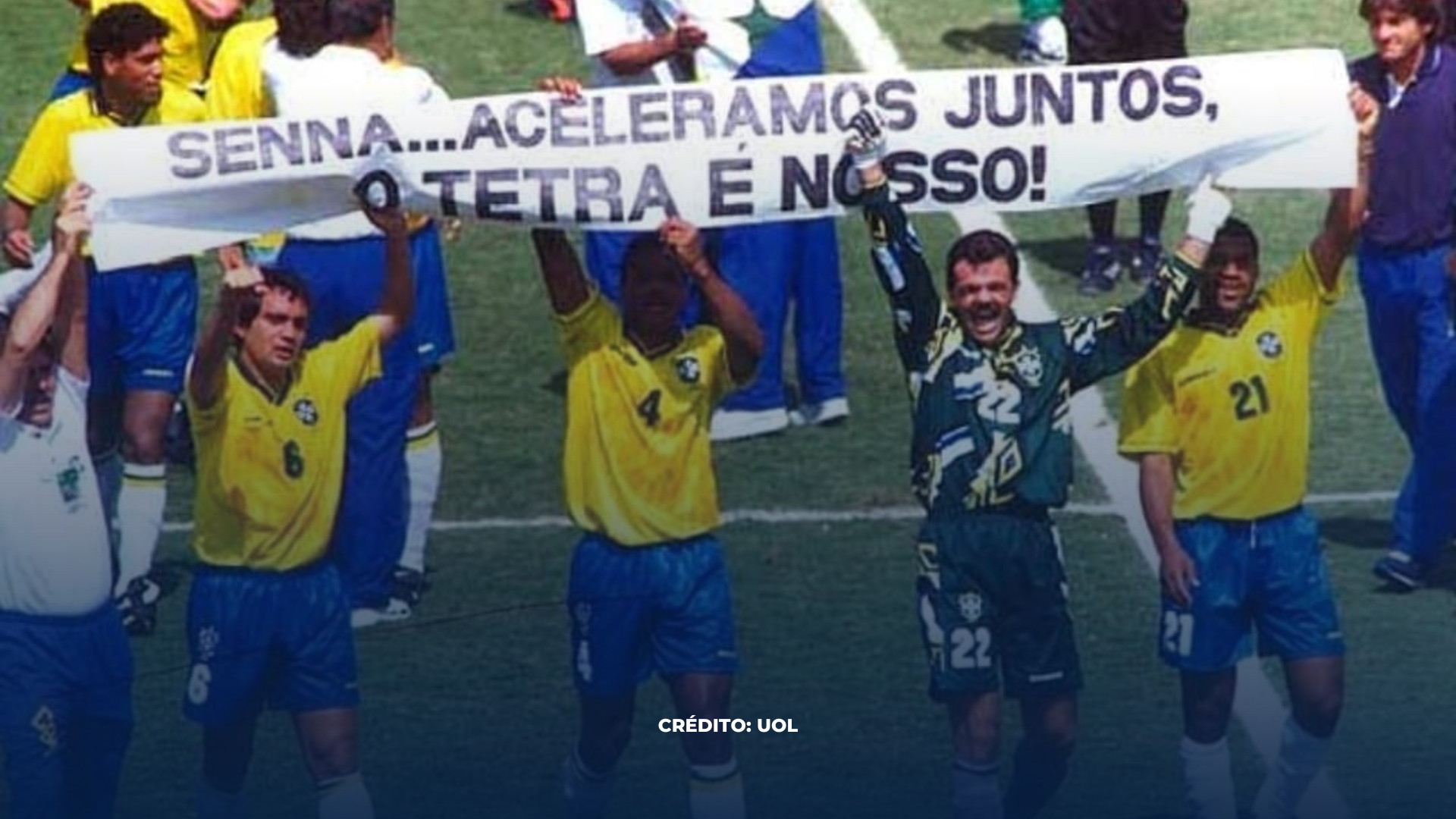 "Senna, aceleramos juntos, o tetra é nosso" - Foi a faixa que jogadores como o lateral direito Branco, o zagueiro Ronaldão, o goleiro Gilmar e o atacante Viola estenderam em solo americano, conforme a imagem a seguir.