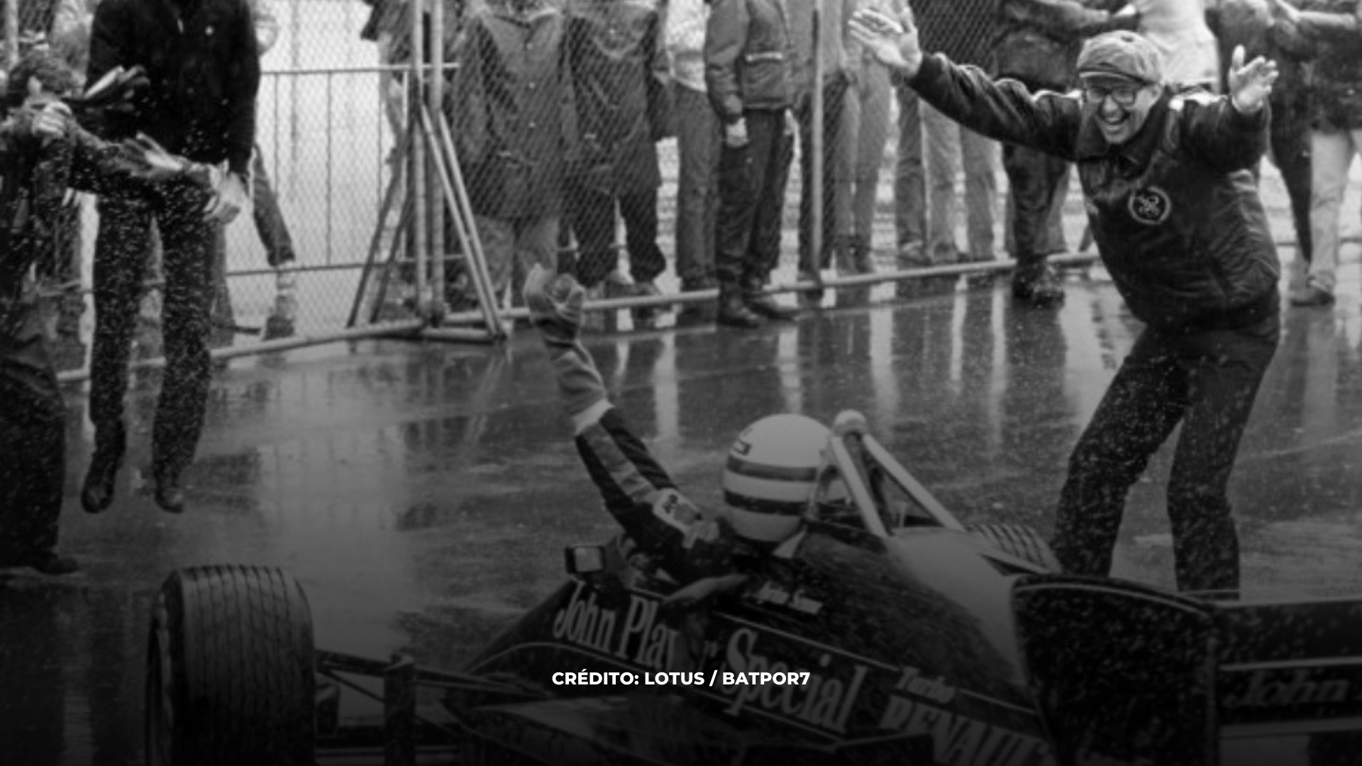 Foto: Ayrton comemorando sua primeira vitória na Fórmula 1 em Estoril no ano de 1985 pela equipe Lotus